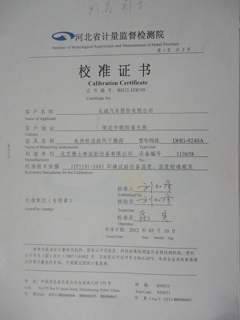>>µçÈȺãιķç¸ÉÔïÏäУ׼֤Êé-ºÓ±±¼ÆÁ¿Ôº-³¤³ÇÆû³µ