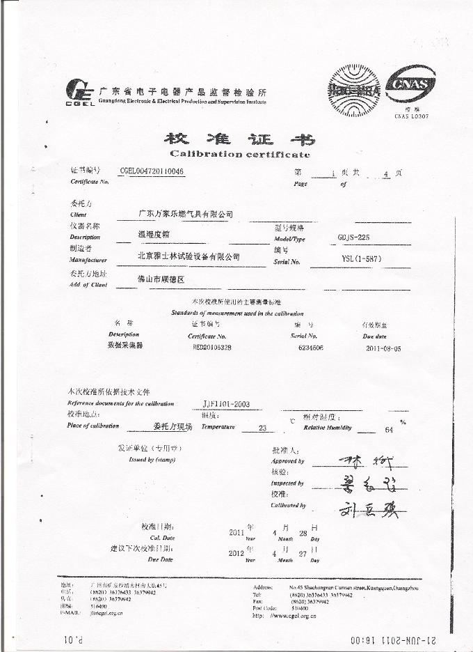 高低温交变湿热试验箱校准证书-广东检验所-万家乐