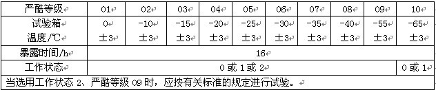 ºãκãʪÊÔÑéÏäÊÔÑùÔÚºãÓ¦Á¦×´Ì¬±©Â¶ÆÚ¼ä£¬Î¶ȱ仯Ӧʮ·Ö»ºÂýÒÔ·ÀÖ¹ÊÔÑùË𻵡£ÓÃÌõ¼þÊÔÑé·½·¨11»ò12ʱ£¬Î¶ȱ仯½×¶ÎÓ¦±£³Ö×î´óµÄÏà¶Ôʪ¶È£¬²¢ÔÚÓйرê×¼ÖÐ˵Ã÷ÊÔÑùÉÏÊÇ·ñÔÊÐí³öÏÖÄý¶¡£ºãκãʪÊÔÑéÏäÊÊÓÃÓÚº½¿Õº½Ìì²úÆ·¡¢ÐÅÏ¢µç×ÓÒÇÆ÷ÒÇ±í¡¢²ÄÁÏ¡¢µç¹¤¡¢µç×Ó²úÆ·¡¢¸÷ÖÖµç×ÓÔªÆø¼þÔڸߵÍλòʪÈÈ»·¾³Ï¡¢¼ìÑéÆä¸÷ÐÔÄÜÏîÖ¸±ê¡£ Ìõ¼þÊÔÑé10·½·¨£ºµÍΣ¨ÏÂͼΪÌõ¼þÊÔÑé·½·¨10µÍεÄÑÏ¿áµÈ¼¶±í£©