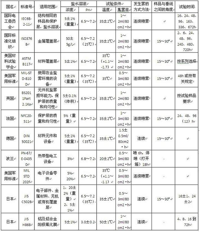 ÑÎÎíÊÔÑéÏä¸÷¹ú±ê×¼ÊÔÑé·½·¨¶ÔÕÕ±íÈçÏ£º