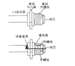 ¹ºµ¥Ïò·§Ò»Ö§£¬½á¹¹¼ûÏÂͼ¡£È¡Ïµ¥Ïò·§µÄ·§Ð¾£¬°Ñµ¥Ïò·§º¸ÔڸߵÍÎÂÊÔÑéÏäµÄ¹¤ÒÕ¹ÜÉÏ¡£È·ÈϺ¸½ÓÀι̡¢ÎÞ©£¬ÔÙ×°ÉÏ·§Ð¾¡£³éÕæ¿ÕʱÓôøÓж¥ÕëµÄ¼Ó·ú¹ÜÁ¬½á£¬ÁíһͷÓë½Ç·§Á¬½Ó¡£È»ºóÔÙ½Ó±íºÍÕæ¿Õ±Ã¡£³éÕæ¿Õºó£¬Ð¶ÏÂÕæ¿Õ±Ã£¬»»Éϼӷú¸ÖÆ¿£¬Åųý½Ç·§ºó£¨µÚ¶þ¸ù¼Ó·ú¹Ü£©¼Ó·ú¹ÜÖÐµÄ¿ÕÆø£¬ÔÙ¼Ó·ú¡£